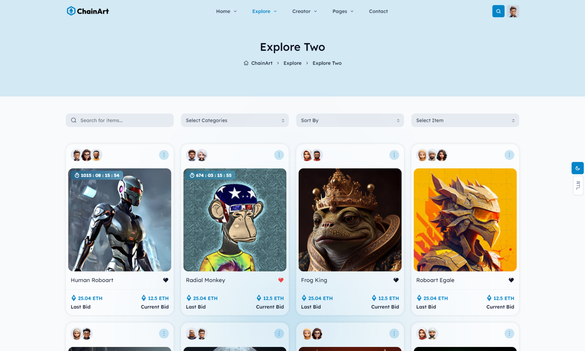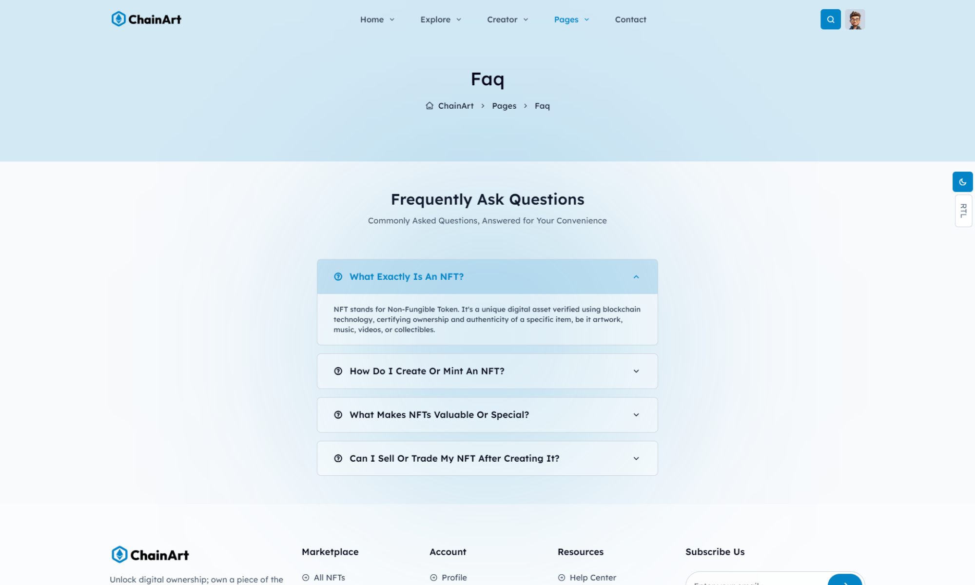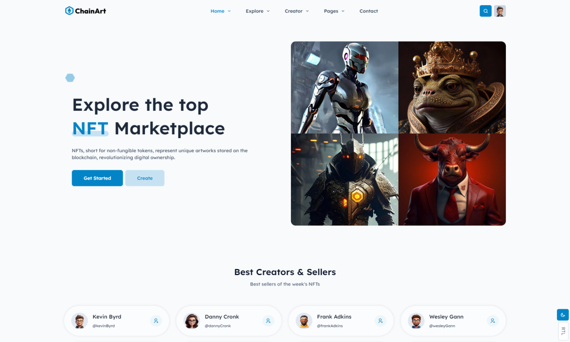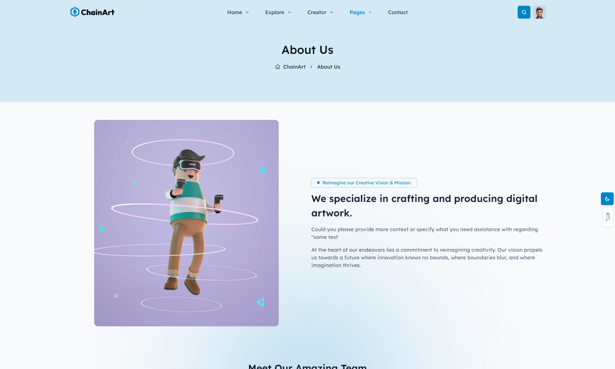 ChainArt supports right-to-left (RTL) languages on both home and inner pages. This includes Arabic, Urdu, Hebrew, Persian, and others, which are predominantly written from right to left. Many countries utilizing these languages have built their NFT websites using our ChainArt template.
